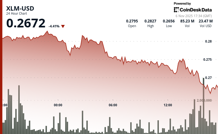 かつて有望なスターだったステラ (XLM) は火曜日に憂鬱な下落幅を拡大し、0.2789 ドルから 0.2727 ドルまで 2.2% 下落した。冷酷なミューズのように0.2815ドルの抵抗線が再び上昇の勢いを抑えた。トークンは0.0124ドルの範囲内で取引されており、4.5%の日中ボラティリティを反映しており、以前の面影はほとんどありません。破滅の合唱のような一連の安値は、一般的な弱気バイアスを裏付けた。ささやかれた約束のように脆弱なサポートは、心理的な0.27ドルレベルの度重なるテストによって強化され、0.2709ドル付近にとどまっている。 🕳️