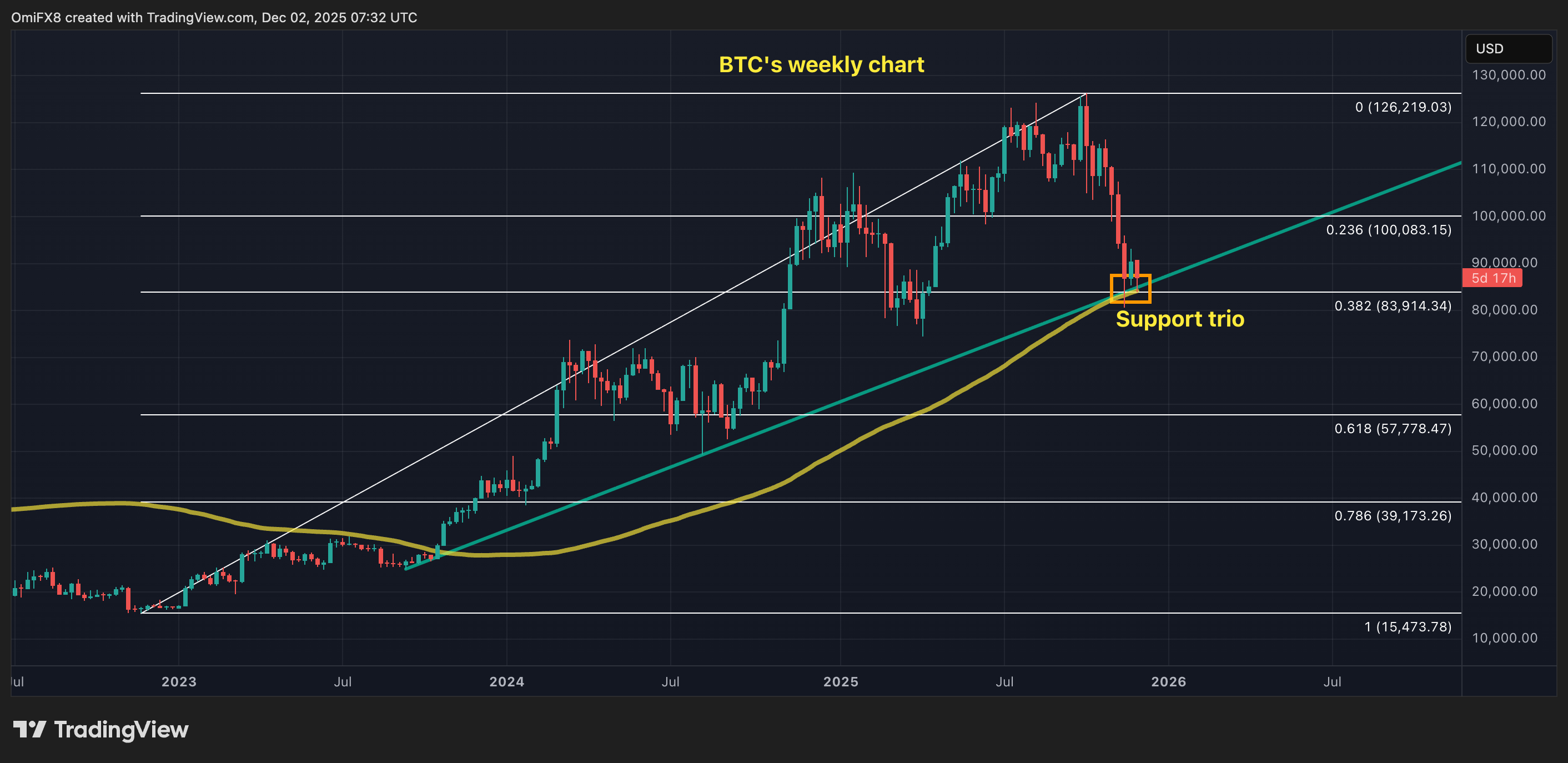 さて、ビットコインについて。独自のドラマが起こっています。暗号通貨の王は大きな岐路に立たされて身も凍っています。これがラブコメだったら、主人公が 2 つの恋愛対象のどちらかを選択しなければならない場面に立つことになりますが、どちらも素晴らしいものではありません。ビットコインは最も重要なサポートラインをしっかりと維持している。強気のトレンドライン(思っているほど刺激的ではない)、100週間SMA(テクニカルに聞こえるだろう?)、そして38.2%のフィボナッチ・リトレースメント(5倍速で言ってみてください)だ。これはどういう意味ですか? BTC は運命の岐路に立っており、これらの境界線の 1 つを超えると、そこからすべてが下り坂になります。 🤷♀️