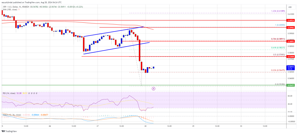 XRP/USDペアの時間足チャートでは、0.590ドルを基準とした一時的な上昇トレンドライン(上昇チャネル)を下回って下落が発生しました。ペアはさらに下落し、サポートレベルの0.5550ドルを下回った。安値は0.5538ドルに達し、現在はこの下落を受けて価格は安定しつつある。